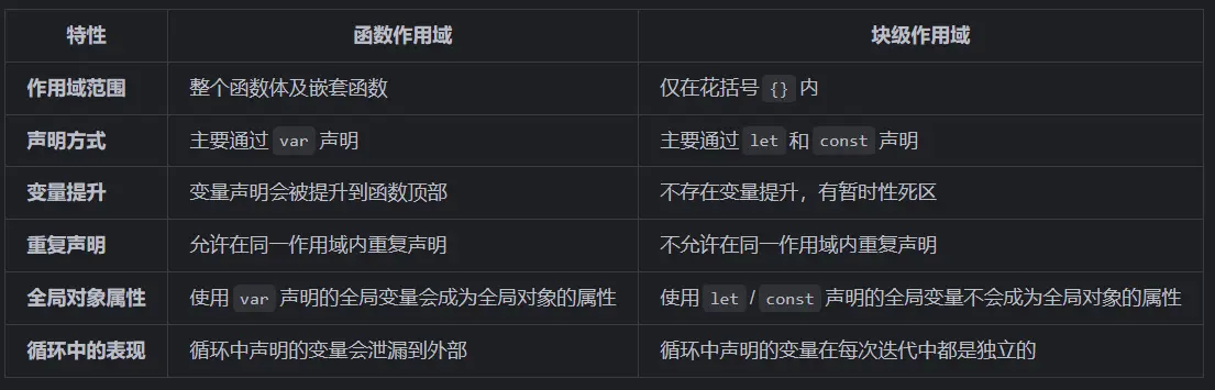 函数作用域 是指变量在声明它的函数内部及其嵌套函数中可访问,外部无法访问。这是ES5及之前版本JavaScript中主要的作用域类型。