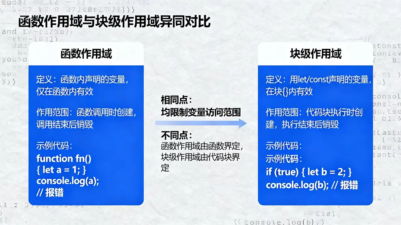 console.log(x); // 输出:100(访问的是外层常量)示例4:代码块内的变量遮蔽