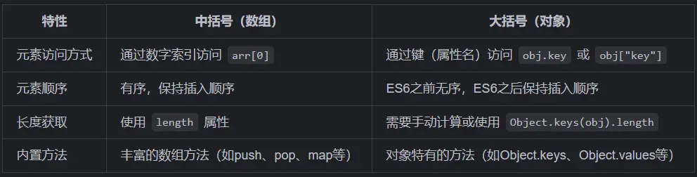 [])主要用于创建和操作数组 ,数组是有序的元素集合,通过数字索引访问元素,适用于需要按顺序存储和访问数据的场景。大括号(