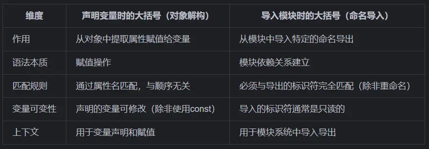 在JavaScript中,大括号 {} 在不同场景下有不同的用法,尤其是在变量声明和模块导入时,其作用和含义有明显区别。下面将详细解析这两种场景下大括号的用法。