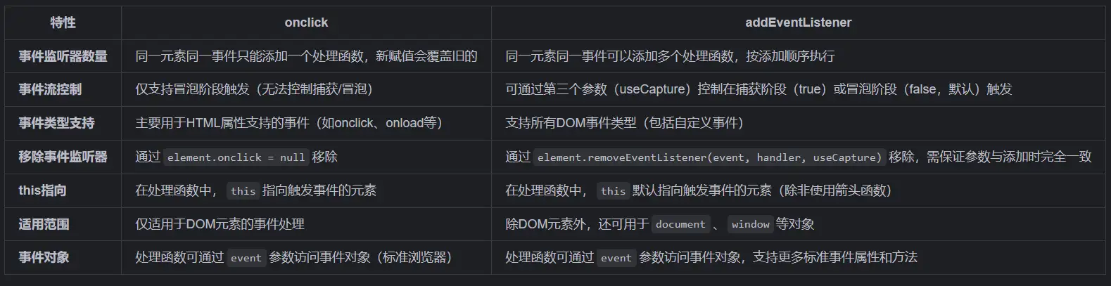 addEventListener:适用于复杂的事件处理场景,尤其是需要添加多个事件处理函数、控制事件流阶段、支持自定义事件或需要灵活移除事件监听器的情况。