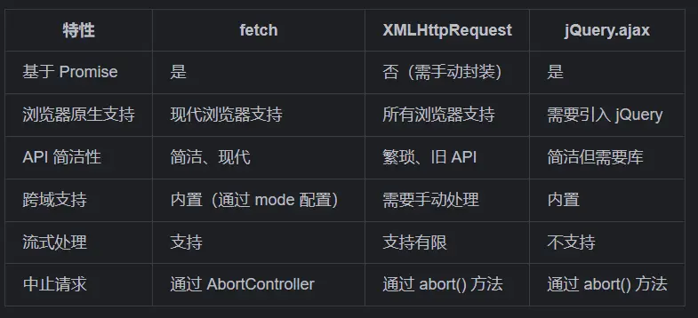 .then(data => console.log(data));7. fetch 与其他请求方式的比较